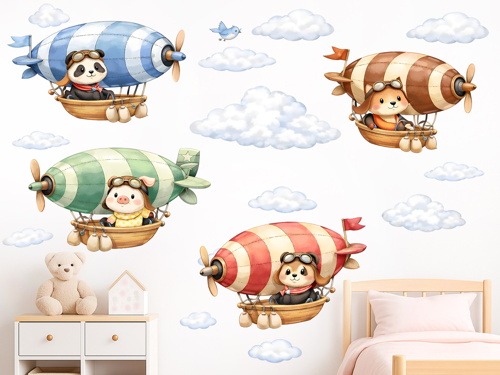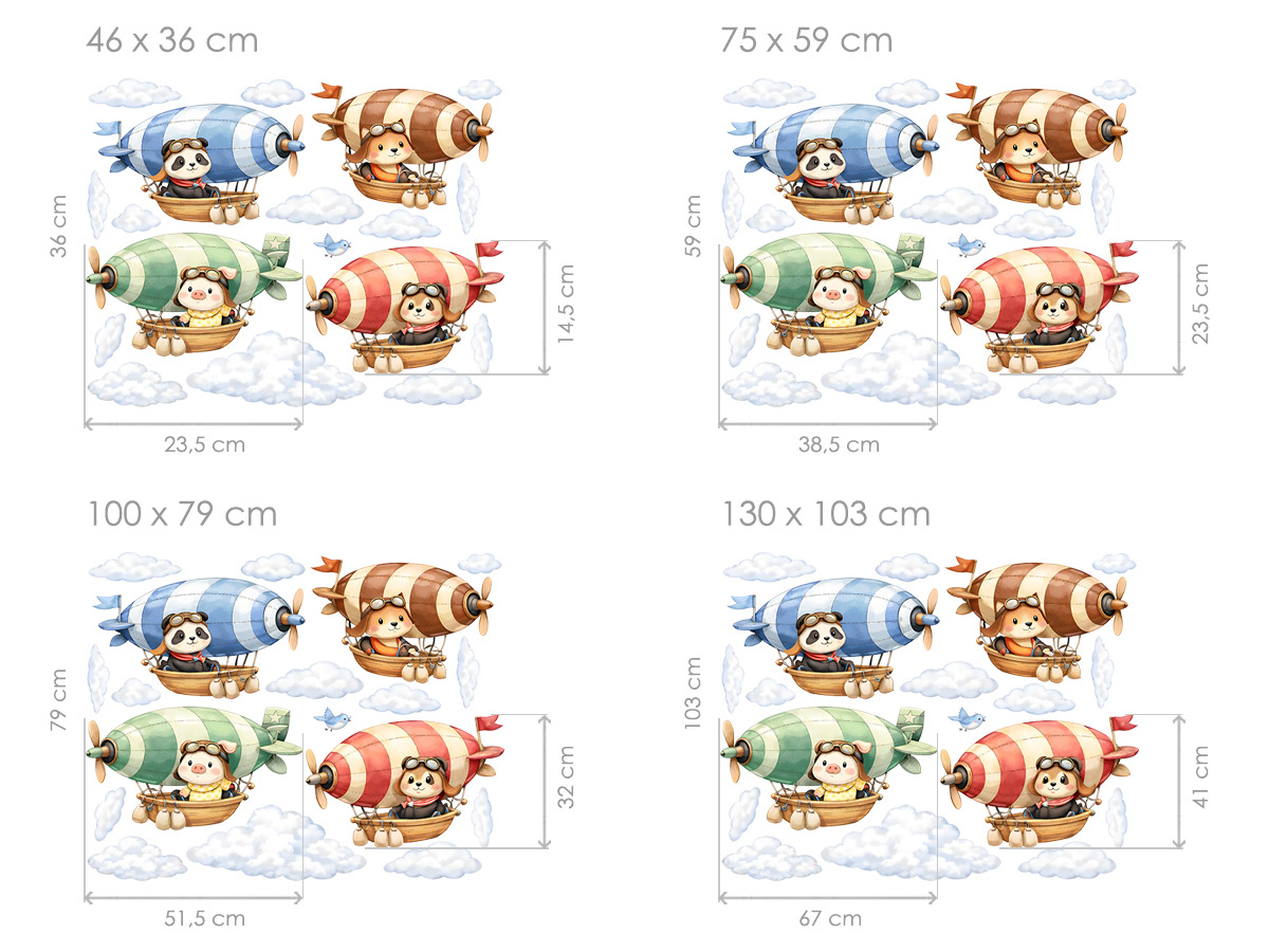 Nálepka na stenu „Vzducholode so zvieratkami“ premení detskú izbu na čarovný svet plný fantázie, dobrodružstva a jemnej rozprávkovej atmosféry. Roztomilé zvieratká pilotujúce farebné vzducholode plávajú medzi oblakmi a vytvárajú hravú, ale pokojnú kompozíciu, ktorá podnecuje detskú fantáziu a pocit bezpečia. Ilustrácie sú vykreslené v jemných pastelových tónoch s akvarelovým efektom, čo im dodáva ľahký, vzdušný dojem, ktorý krásne zapadá do moderných aj klasických detských interiérov. List obsahuje jednotlivé nálepky vzducholodí, oblakov a malých detailov, ktoré je možné usporiadať podľa vlastnej fantázie a vytvoriť tak originálnu scénu, ktorá bude vyhovovať priestoru a atmosfére izby. Ideálna voľba pre malých snílkov, ktorí milujú zvieratá, lietanie a rozprávky.
