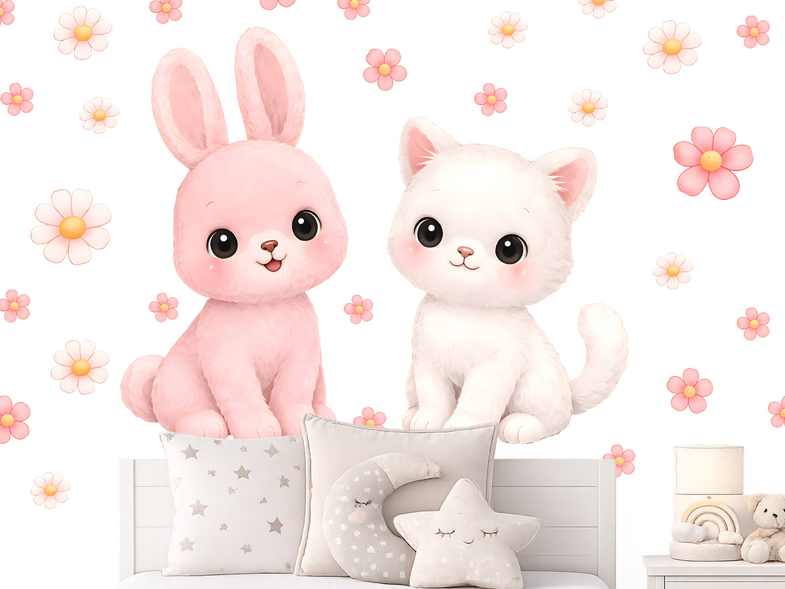 Samolepka na stenu Zajačik a mačiatko prináša do detskej izby nežný a roztomilý motív, ktorý si deti okamžite zamilujú. Kombinácia ružového zajačika a jemného mačiatka pôsobí hravo, priateľsky a zároveň veľmi upokojujúcim dojmom. Jemné pastelové farby a hebký štýl ilustrácie vytvárajú príjemnú a útulnú atmosféru. Veľké oči, mäkké tvary a detailne spracovaná srsť dodávajú postavičkám kúzelný a láskavý výraz. Doplnenie o drobné kvietky v pozadí celý motív krásne zjednocuje a dodáva mu ľahkosť. Samolepka sa skvele hodí nad postieľku, do hracieho kútika alebo na hlavnú stenu v detskej izbe. Ideálna voľba pre malé deti, ktoré milujú zvieratká, jemné farby a rozprávkovo ladené prostredie.