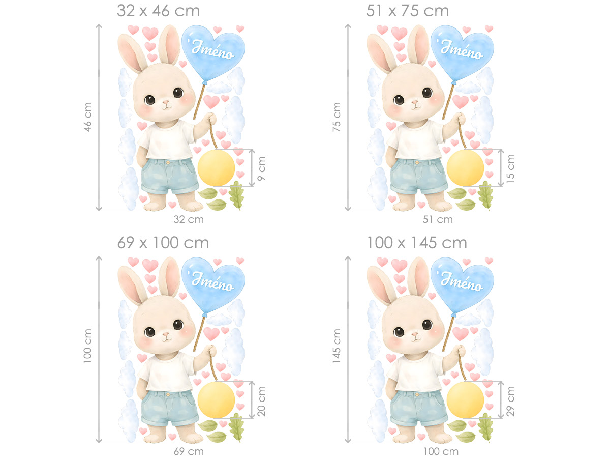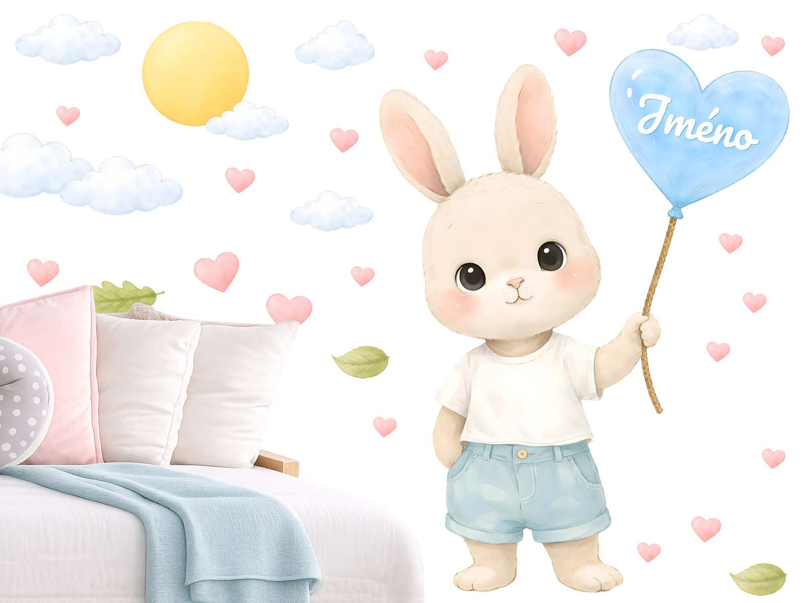 Meno podľa želania v srdiečku-balóniku môže byť uvedené samostatne alebo v kombinácii s dátumom narodenia či napríklad vekom (tento údaj bude zarovnaný na stred pod menom v druhom riadku). Text zadajte v 3. kroku objednávky do poľa „poznámka“. Ak máte špeciálne želanie, kontaktujte nás: info@nalepte.cz. Nálepky na stenu Zajačik s balónikom a menom vnášajú do detskej izby jemnosť, hravosť a osobné kúzlo. Roztomilý zajačik v pastelových farbách drží balónik v tvare srdca, do ktorého je možné umiestniť meno dieťaťa, čím vzniká jedinečná a milá dekorácia. Motív dopĺňajú drobné srdiečka, obláčiky, slniečko a lístočky, ktoré spoločne vytvárajú ľahkú a harmonickú atmosféru. Celý dizajn pôsobí veľmi nežne a upokojujúco, čo je ideálne pre detské prostredie. Táto dekorácia krásne vynikne nad detskou postieľkou alebo posteľou a vďaka personalizácii dodá izbe jedinečný charakter. Skvele sa hodí do izbičky pre chlapcov aj bábätká, kde vytvorí útulné a láskyplné miesto.
