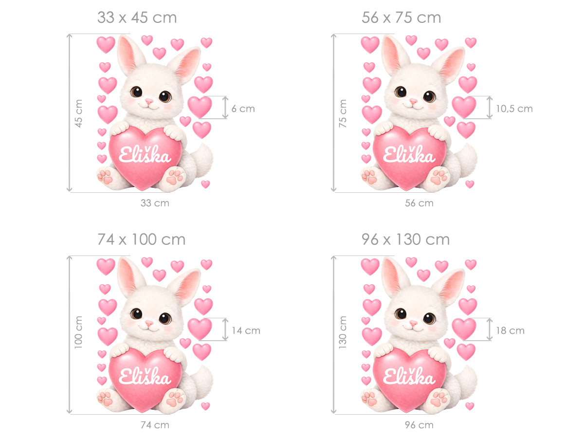 Meno na prání v srdíčku je mo|né samotné alebo kombinovať s dátumom narodenia. alebo napríklad vekom (tento údaj bude vycentrován pod jménom v druhém riadku). Text zadajte v 3. kroku objednávky do pola "poznámka". Ak máte speciální prání kontaktujte nás: info@nalepte.sk. Bude Vám zaslaán náhlad na schálení emailom. Samolepka na stenu Zajaíček so srdíčkom a jménom vnesie do detskéej izby nežnú, láskyplnú atmosféru plnú radosti a osobního kúzla. Roztomilý bílý zajaíček s velkýma očami objímající ružové srdíčko pôsobí milo a upokojujícím dojmom, zatímco drobná srdíčka okolo vytvorírejí hravú a hrejivú náladu. Motív je navrhnutý tak, aby sa stal jedinečnou súčástí detského sveta – jméno na srdíčku dodává dekoráciu osobní rozmer a vytváraí silneé citové puto medzi diaítetom a obráskom. Jemné pastelové farby, hebký vzhľad srsti a mäkké tvary sa krásne hodí do izbíčku pre bábätká aj vetší deti a ľahko zapadnú do jemne ružovích, neutrálních i svetlých interiérov. Zákazník obdrí hárok s hlavním motívom zajaíčka doplnený o samostatná srdíčka, diaíky ktor&m##mej je možné vytvoriť harmonickú a hravú kompozíciu poda vlastneí predstavy. Celý dizajn pôsobí nežne, nadčasovo a veľmi milo a stane sa krásným osobním doplnkom detskej izby.