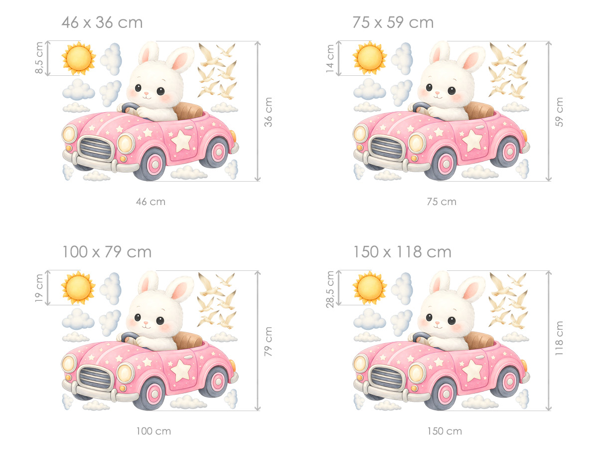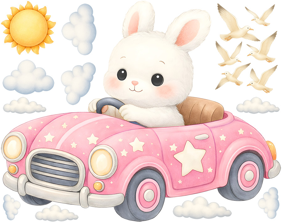 Samolepka na stenu Zajaíček v autíčku vnesie do detskej izby kúzelnú, nežnú a hravú atmosféru plnú fantázie. Roztomilý bílý zajíček idúcí v ružovém autíčku posetém hviezdičkami pôsobí milo a priátelsky, zatímco obláčky, slníčko a poletující ptáčci vytvárají pocit pokoja a snového sveta. Motív prirodzene podporuje detskú predstavivosť a navodzuje pocit pohody, bezpečí a radostného objavování. Jemné pastelové farby a mäkké tvary krásne zapadnú do izbyíčku pre bábätká aj vetší deti a ľahko sa kombinují s neutrálním aj jemne ružovým interiérom. Zákazník obdrí hárok s hlavním motívom zajaíčka v autíčku doplnený o samostatné dekoratívneí prvky, diíky ktor&m#3;ou je možné vytvoriť harmonickú kompozíciu poda vlastneí predstavy. Celý dizajn pôsobí ľahko, nadčasovo a veľmi roztomilo, a stane sa pôvabnou dominantou detskej izby.