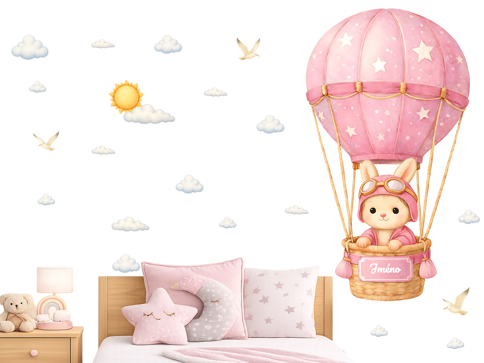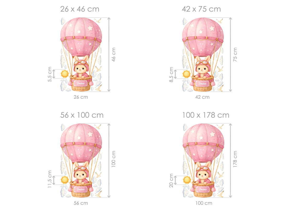 Názov na štítku na koši horúcovzdušného balóna môže mať dĺžku až 12 znakov. Text zadajte v kroku 3 objednávky do poľa „poznámka“. Ak máte akékoľvek špeciálne požiadavky, kontaktujte nás na adrese info@nalepte.cz. Táto jemná nálepka s králikom letiacim v ružovom balóne prinesie do detskej izby rozprávkovú atmosféru plnú pokoja a radosti. Jemné pastelové farby, obláčiky a drobné detaily vytvárajú teplý motív, ktorý krásne doplní interiér izby bábätka alebo malého dieťaťa. Možnosť pridať meno robí z nálepky osobný a originálny prvok, ktorý poteší nielen deti, ale aj rodičov. Je ideálna ako dekorácia nad detskú postieľku alebo posteľ a tiež ako krásny darček k narodeniu, krstu alebo narodeninám.