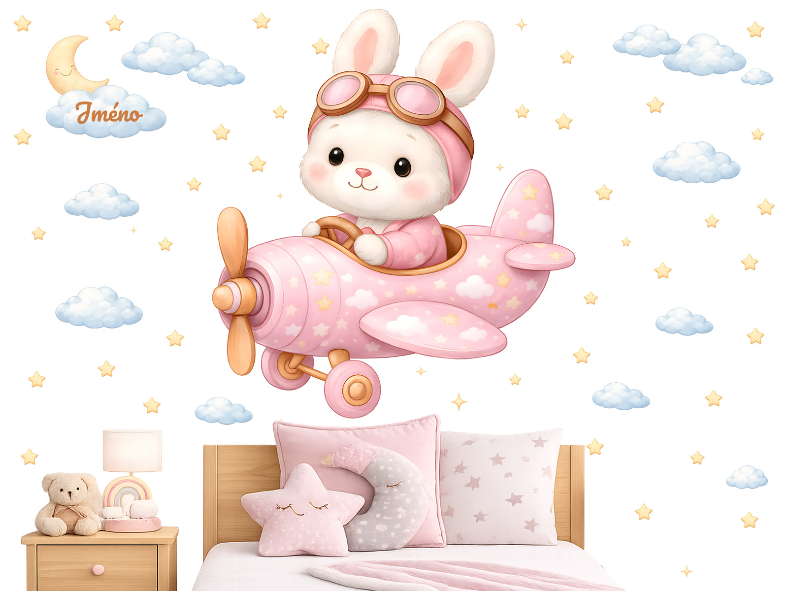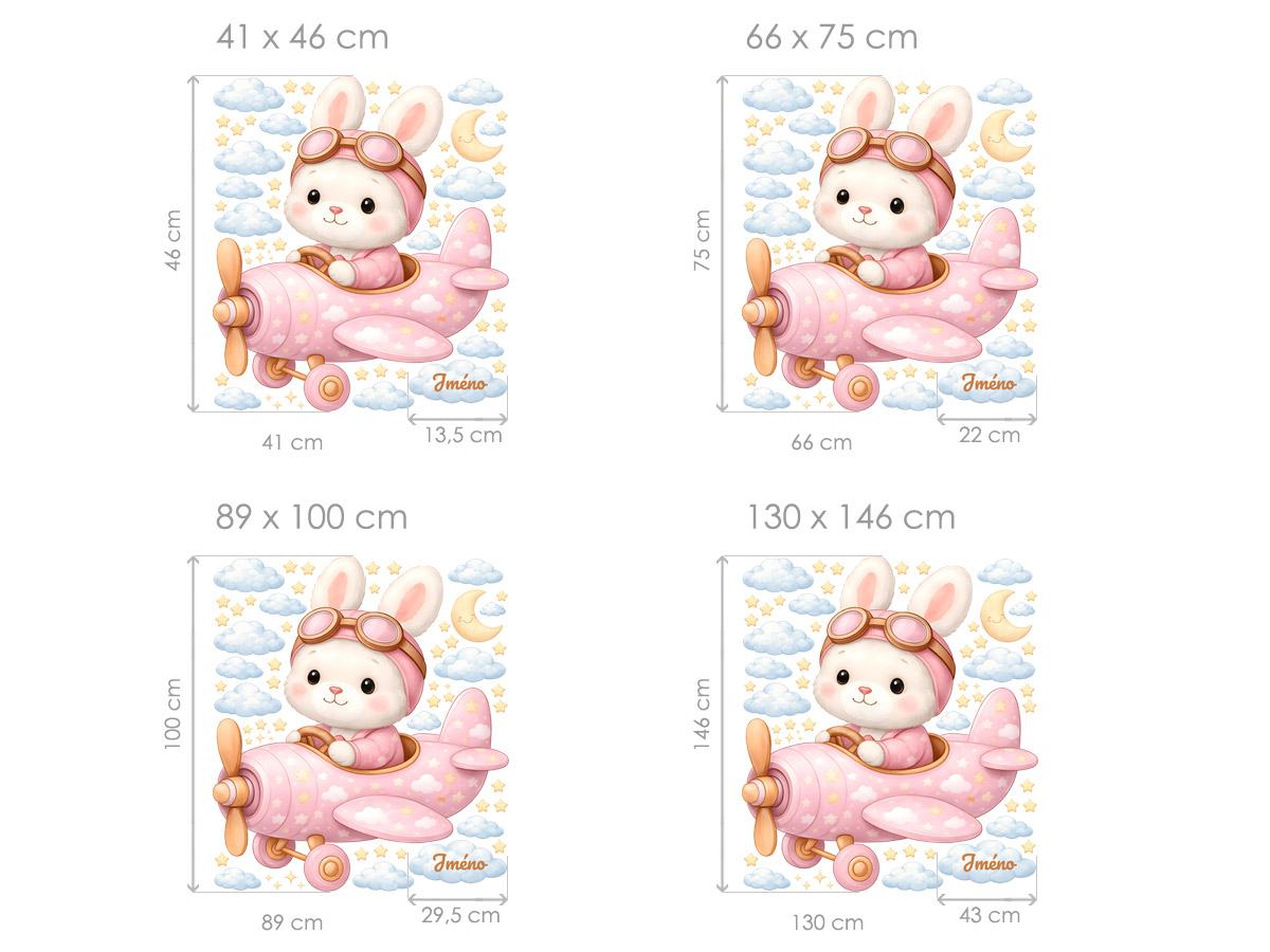 Názov na obláčiku môže mať maximálne 12 znakov. Text zadajte v kroku 3 objednávky do poľa „poznámka“. Ak máte akékoľvek špeciálne požiadavky, kontaktujte nás na adrese info@nalepte.cz. Táto roztomilá nálepka s králikom pilotom v ružovom lietadle premení izbu vášho dieťaťa na kúzelnú oblohu plnú snov a dobrodružstiev. Jemné pastelové farby, oblaky a hviezdy vytvárajú pokojnú a hravú atmosféru, ideálnu pre bábätká a malé deti. Nálepku je možné personalizovať menom podľa vášho výberu, čím vytvoríte originálnu a osobnú dekoráciu, ktorá poteší deti aj rodičov. Je ideálna nad detskú postieľku, posteľ alebo detský kútik a dodá priestoru pocit ľahkosti a fantázie.