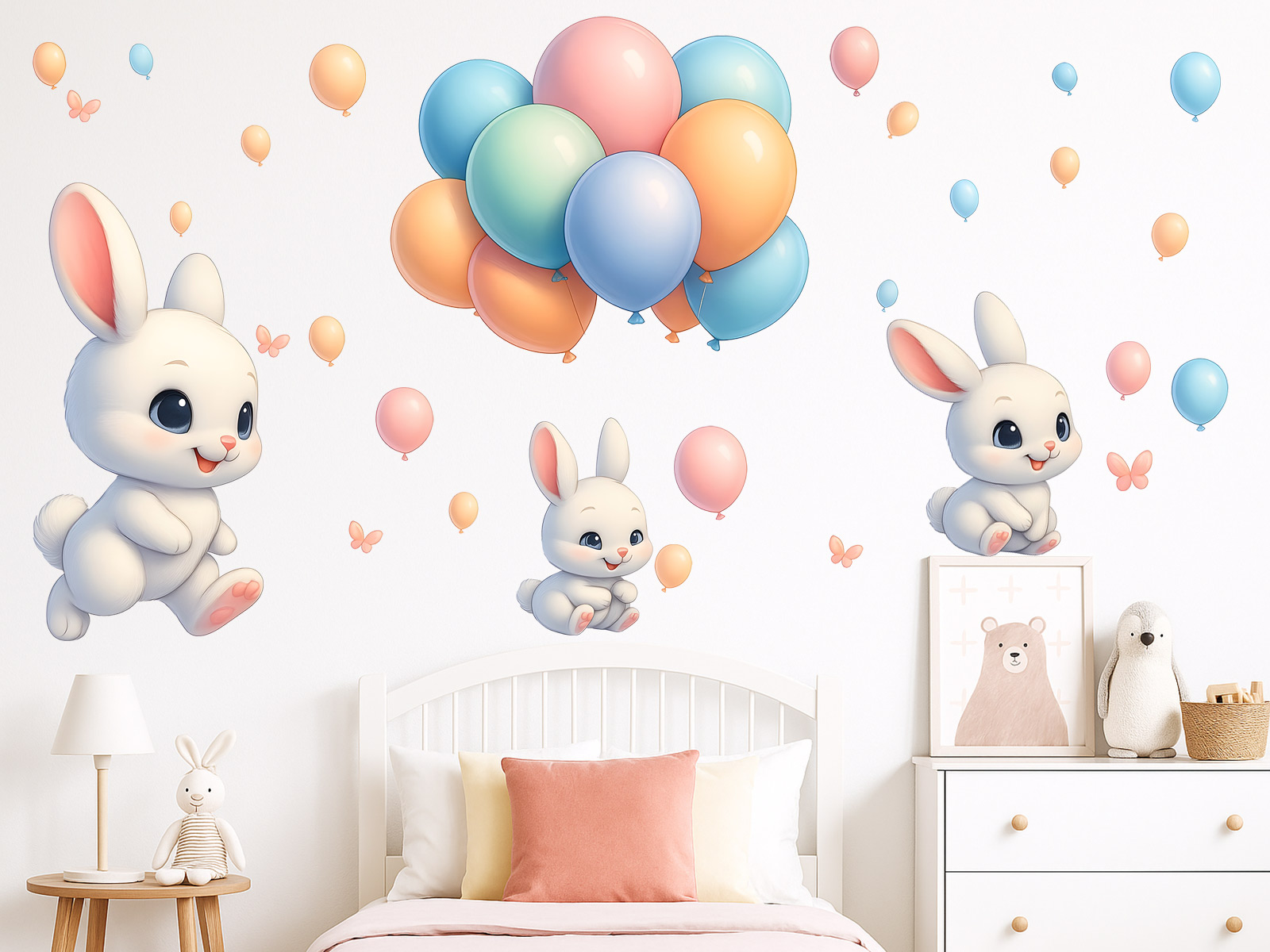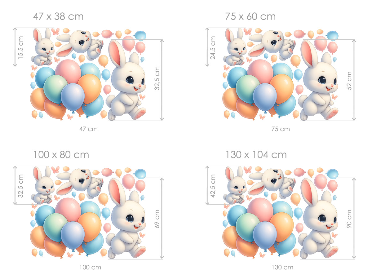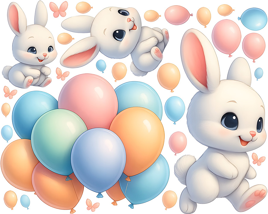 Samolepka na stenu Zajaíci s balónkami priáší do detskéej izby kúzelnú atmosféru plnú radosti, jemnosti a hravé energie. Sada obsahuje niekoπko roztomilích zajaíčkov v rôznych&´ch pózách – jeden veselo beží, druhý dovádí vo vzduchu a další sedí a sleduje farebné balóniky okolo seba. Nad nimi sa vznáší velký zväzok pastelových balónikov v odínoch ružové, broskyňé, modré a zelené, doplnenýý drobnými létajícími balónkami a jemnými motýlkami, ktoré celému motívu dodávají ľahkosť a snový charakter. Ilustrácie sú vytvorenéé v hebkém, jemne realistickém štýle s čistým bílým pozadím, takže krásne zapadnú do každého detského izby a vytvorí pocit veselého, priátelského sveta plného fantázie a radosti.
