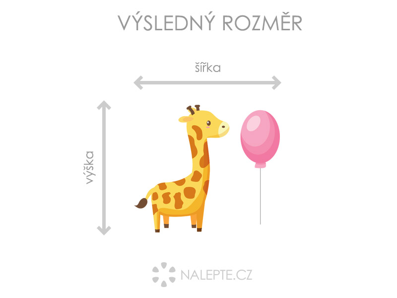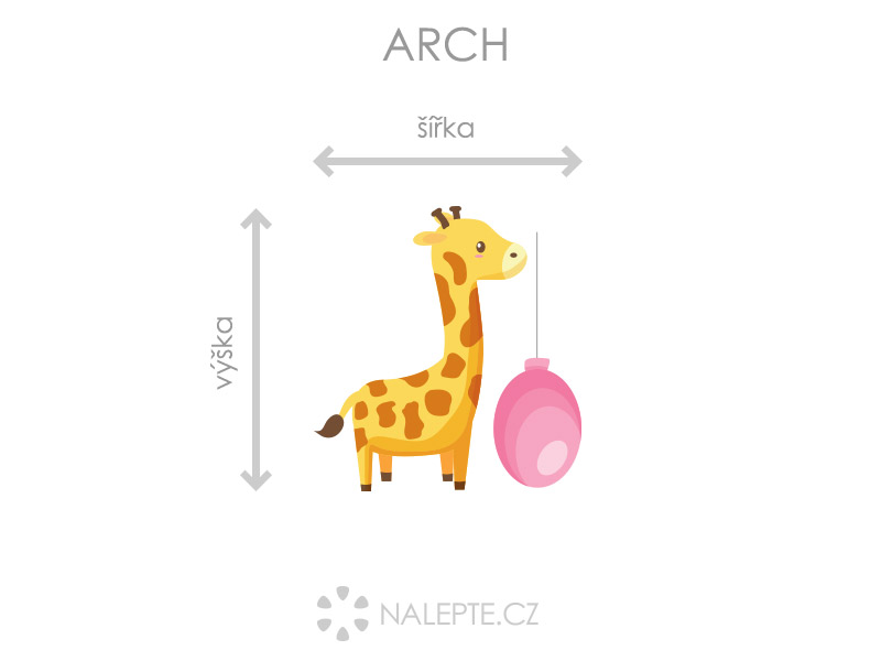 Výposledný rozmer = rozmer po nalepení na stenu podľa hlavní produktové fotografie (samozrejme môžete rozlepiť prvky úplne ľubovoľne a získáte úplne iné výposledné rozmery). Arch = takto vám bude samolepka doručená. Z hárku jednotlivé části odlepíte a nalepíte na stenu tak, aby zložili výposledný motív podľa Vašich predstáv. Arch si môžte prehliada'a vo fotogalérii. Rozmer archu volíte v objednáke. Prehľad rozmerov (šírka x výška): a) výposledný rozmer 50 x 45 cm = hárok 42 x 45 cm b) výposledný rozmer 84 x 75 cm = hárok 70 x 75 cm c) výposledný rozmer 112 x 100 cm = hárok 94 x 100 cm d) výposledný rozmer 156 x 138 cm = hárok 130 x 138 cm Výška žirafky odpovedídá výške hárku.