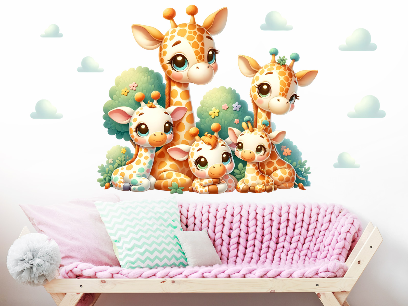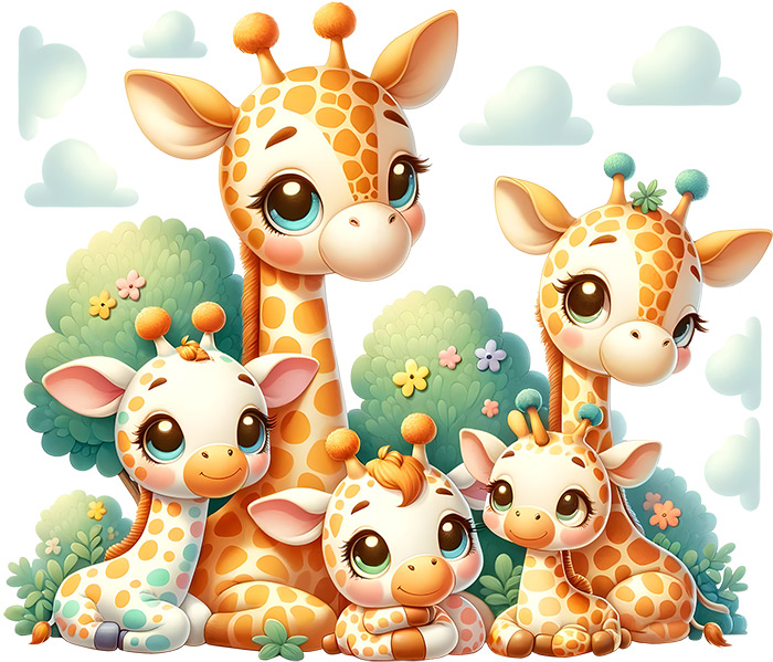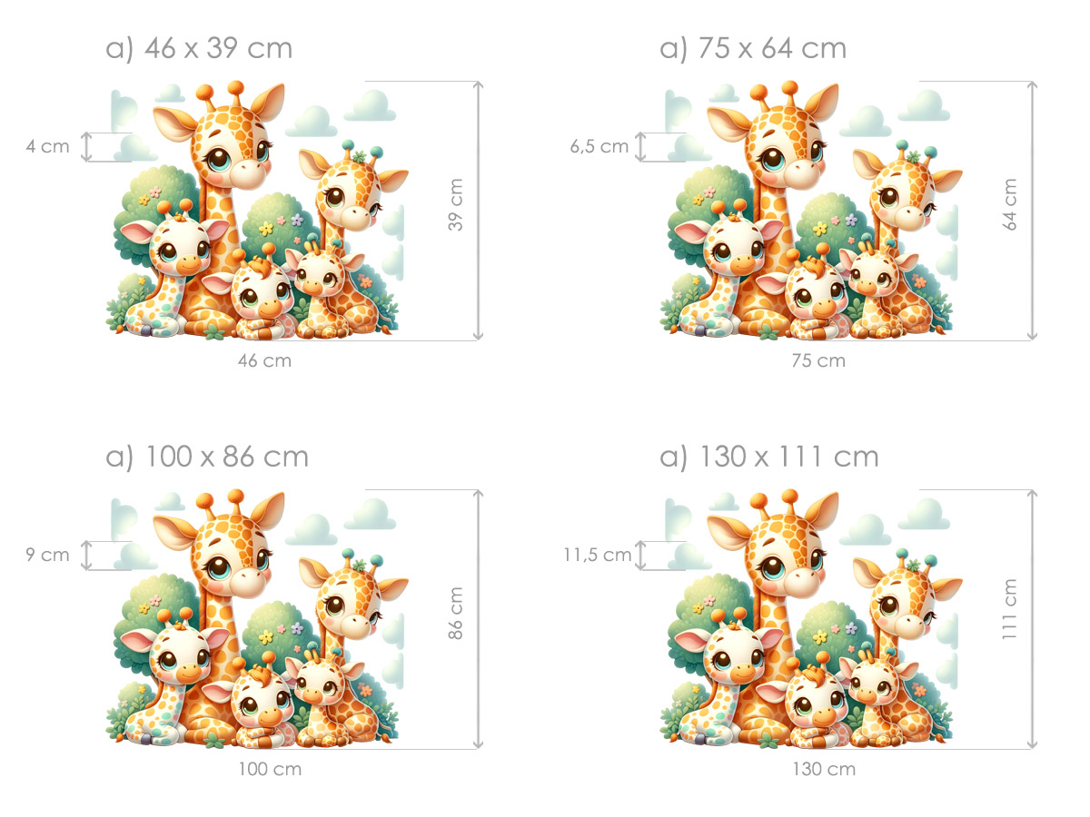 Veselá a hrejivá sada samolepiek na stenu s motívom žirafí rodinky prinesie do detskej izby pohodu, smiev a hravosť. Roztomilé žirafky s veľkýma očami, jemnými pastelovými farbami a priátelským výrazom premení každý interiér v kúzelneé místo plné radosti a fantázie. Ideální výzdoba pre detský izba, herňu alebo kútik pre bábätko – žirafky sa stanú oblíbenými kamarády vašich najmenších.