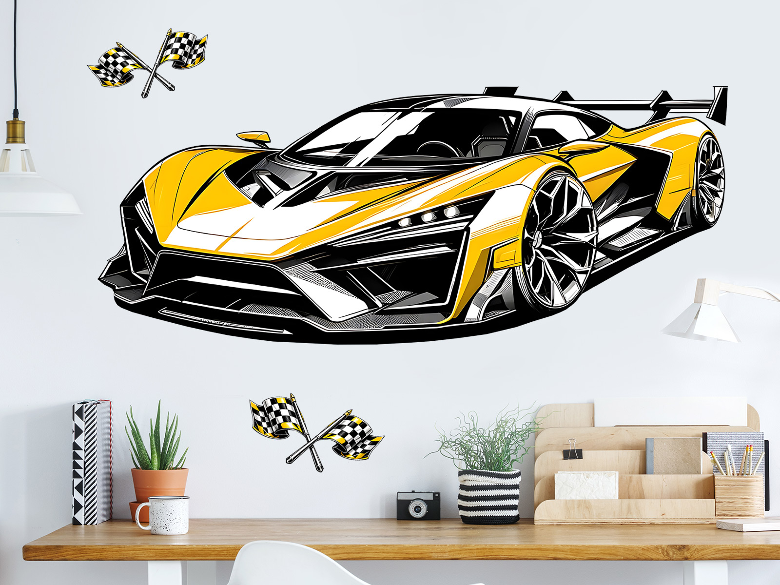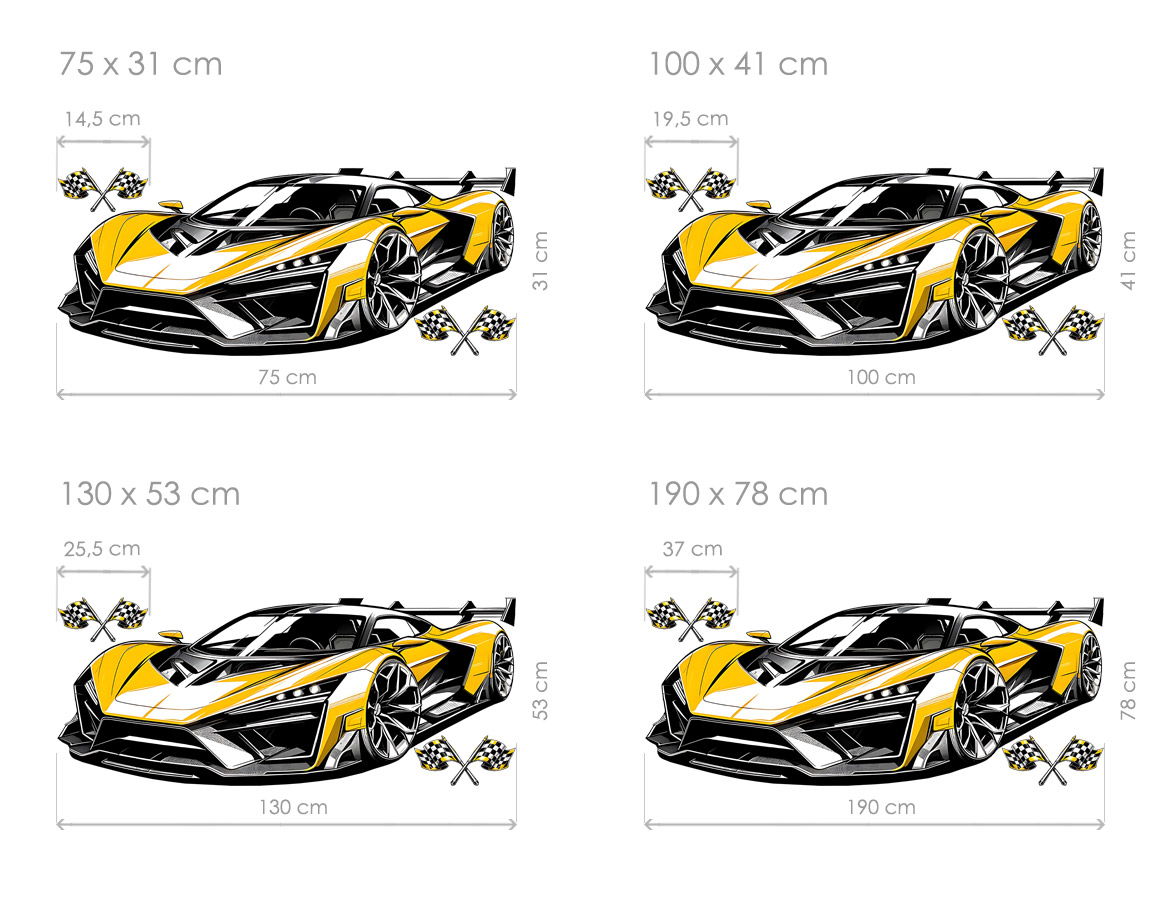 Samolepka na stenu „Žltý športák“ je neprehliadnuteľnú dekoráciu; pre všetky milovníky rýchlosti, moderního dizajnu a výrazného štýlu. Dynamický športí auto v kontrastnom žlto-čiernom uskutočnení pôsobí energicky, odvážne a futuristicky, ako by právo vystrelil z dráhy prímo na stenu. Ostré línie, níský profil a detailní grafické spracování dodávají motívu silný vizuální vplyv a vytárejí pocit pohybu aj adrenalínu. Samolepka sa stane dominantním prvkom interiéru a skvele zapadne do izby teenagera, pracovne alebo moderního priestoru, kde podtrhne osobití charakter a vášeň pre výkonné športí vozidlá.