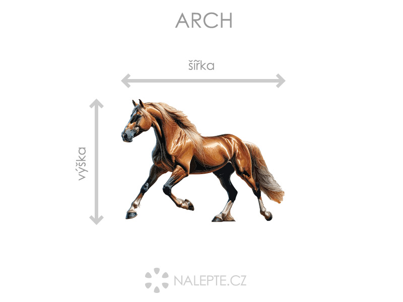 Arch = Arch si môžete prehliadnuť vo fotogalérii. Rozmer archu volíte v objednáke. Prehľad preddefinovaních rozmerov (šírka x výška): a) hárok 47 x 35 cm b) hárok 75 x 56 cm c) hárok 100 x 75 cm d) hárok 130 x 98 cm Je možné zvoliť aj ľubovoľneý vlastní rozmer hárku pomocí posuvníku alebo klikání na "Vetší", "Menší" Krázná samolepka bežícího žrebca pre všetkych milovníkov koní. Samolepka je vhodná do izbíkov nadšených chlapcov alebo dia&vek, ktoré milují kone, ale samozrejme nielen pre nich. V ponídke také máme další samolepky koní v podobném vykonaní, stačí si len vybrať.
