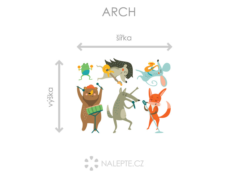 Výposledný rozmer = rozmer po nalepení na stenu podľa hlavní produktové fotografie (samozrejme môžete rozlepiť prvky úplne ľubovoľne a získáte úplne iné výposledné rozmery). Arch = takto vám bude samolepka doručená. Z hárku jednotlivé části odlepíte a nalepíte na stenu tak, aby zložili výposledný motív podľa Vašich predstáv. Arch si môžte prehliada'a vo fotogalérii. Rozmer archu volíte v objednáke. Prehľad rozmerov (šírka x výška): a) výposledný rozmer 62 x 49 cm = hárok 48 x 38 cm b) výposledný rozmer 97 x 78 cm = hárok 75 x 60 cm c) výposledný rozmer 130 x 104 cm = hárok 100 x 80 cm d) výposledný rozmer 212 x 169 cm = hárok 163 x 130 cm