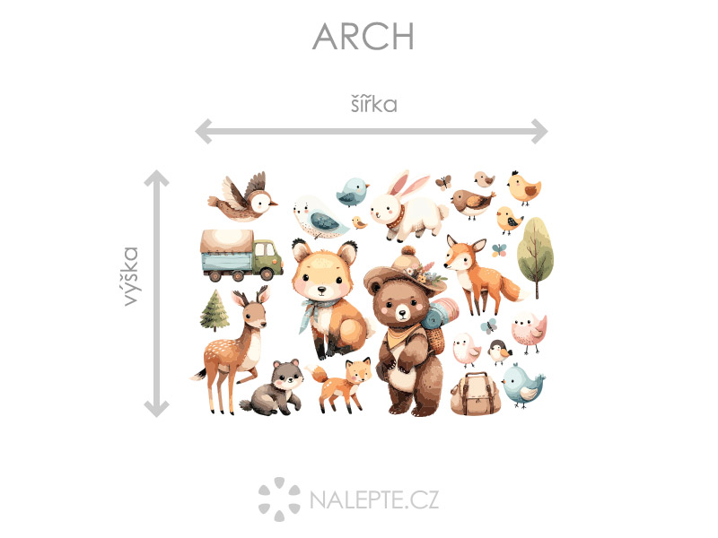 Arch = takto vám bude samolepka doručená. Každý prvok na archu je samostatná samolepka, jednotlivé části jednoduše od papírového podkladu odlepíte a nalepíte na stenu tak, aby zložili výposlední motív podľa Vašich predstáv. Arch si môžte prehliada'a vo fotogalérii. Rozmer archu volíte v objednáke. Prehľad preddefinovaních rozmerov (šírka x výška): a) hárok 47 x 32 cm b) hárok 75 x 51 cm c) hárok 100 x 68 cm d) hárok 147 x 100 cm Je možné zvoliť aj ľubovoľneý vlastní rozmer hárku pomocí posuvníku alebo klikání na "Vetší", "Menší"