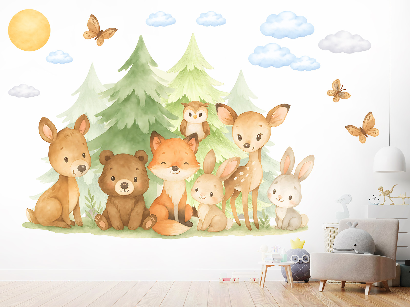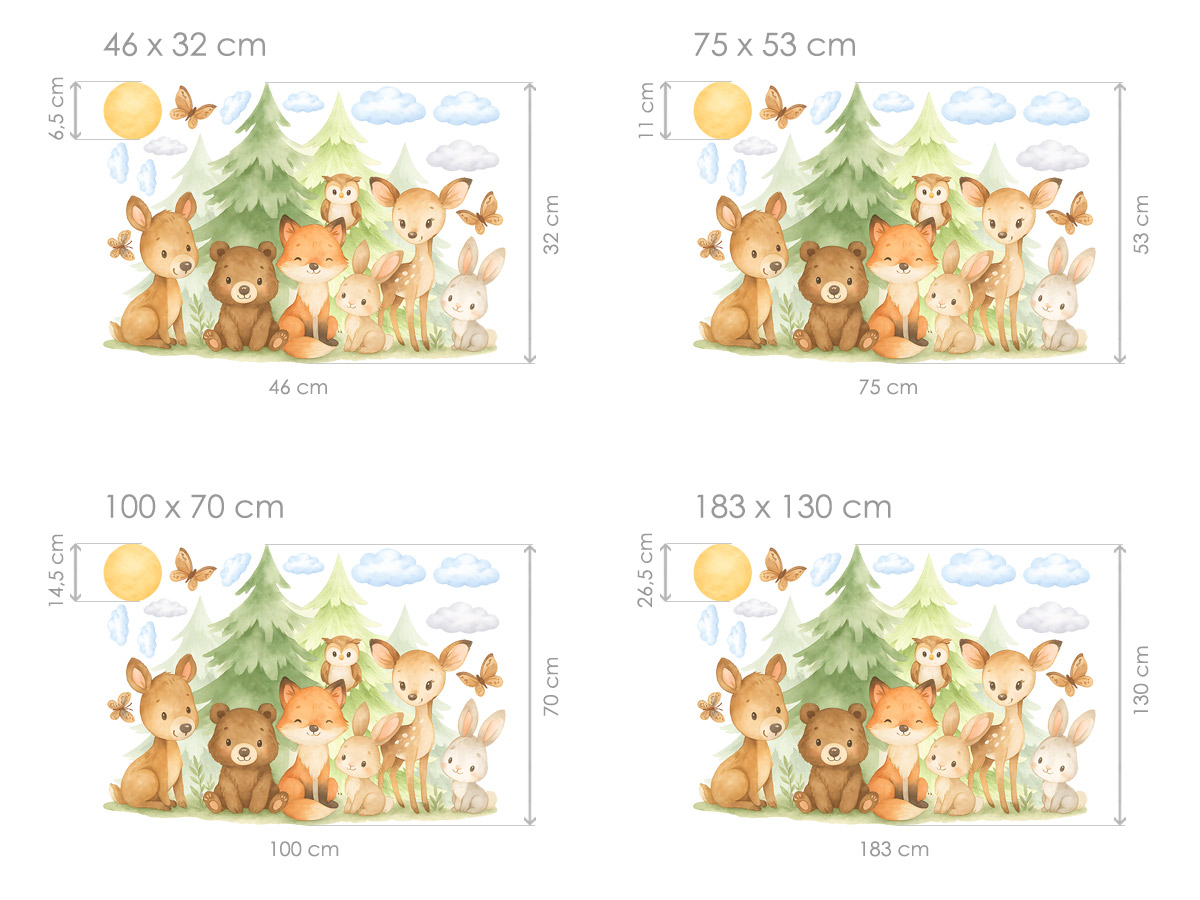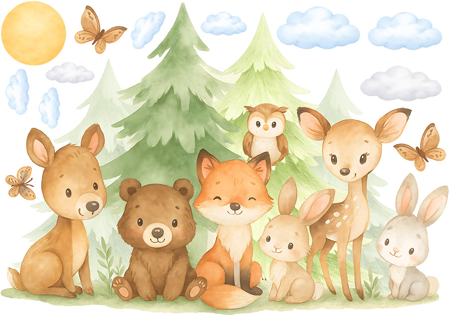 Nálepka na stenu Zvieratká v lese premení detskú izbu na čarovné a pokojné miesto plné prírody, pokoja a priateľstva. Roztomilé lesné zvieratká – líška, medveď, jeleň, zajace a sova – sediace medzi jemnými stromami vytvárajú harmonickú scénu, ktorá má príjemný, upokojujúci účinok a podnecuje fantáziu a snenie. Jemné akvarelové stvárnenie, mäkké pastelové farby a ľahké detaily, ako sú mraky, motýle a slnko, dodávajú motívu vzdušný charakter a nadčasovú eleganciu. Ilustrácia je ideálna do izieb bábätiek a starších detí a krásne zapadá do prírodných, škandinávskych a neutrálnych interiérov. Zákazník dostane list s hlavným motívom lesných zvierat, doplnený samostatnými dekoratívnymi prvkami, vďaka ktorým je možné vytvoriť vyváženú a útulnú kompozíciu podľa vlastných predstáv. Celý dizajn pôsobí jemne, harmonicky a teplo a stane sa krásnym stredobodom každej detskej izby.