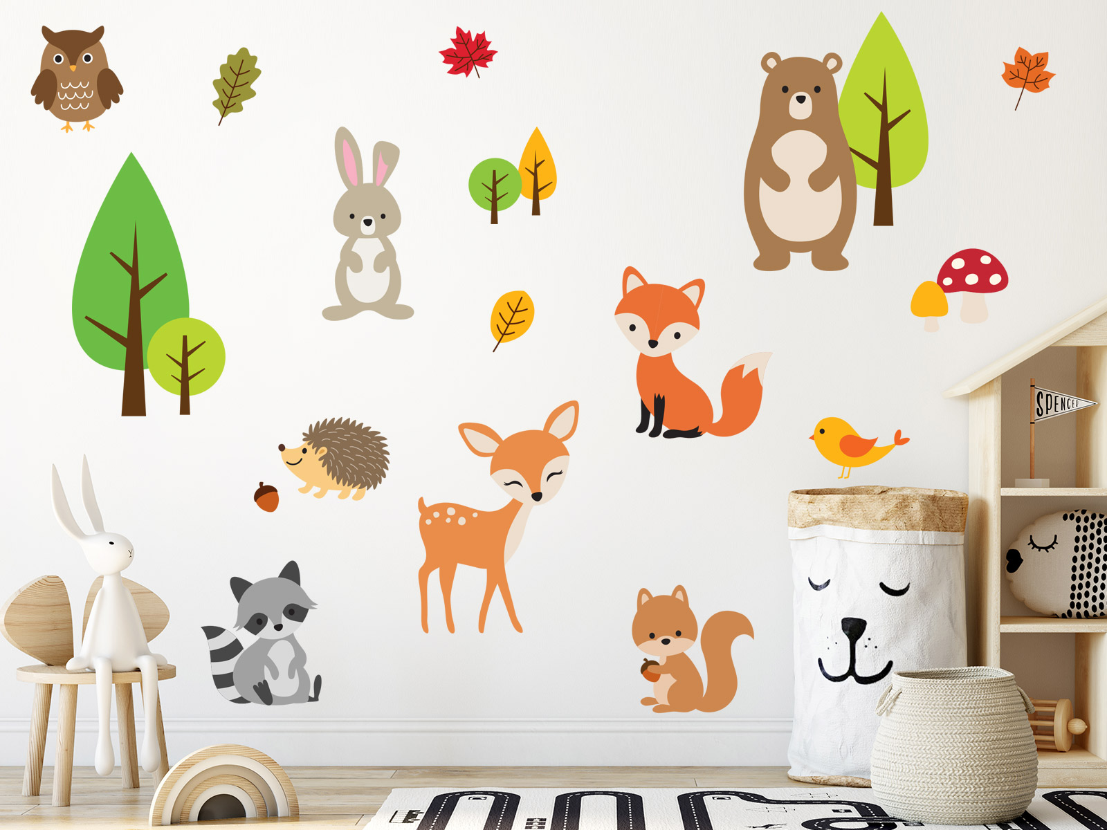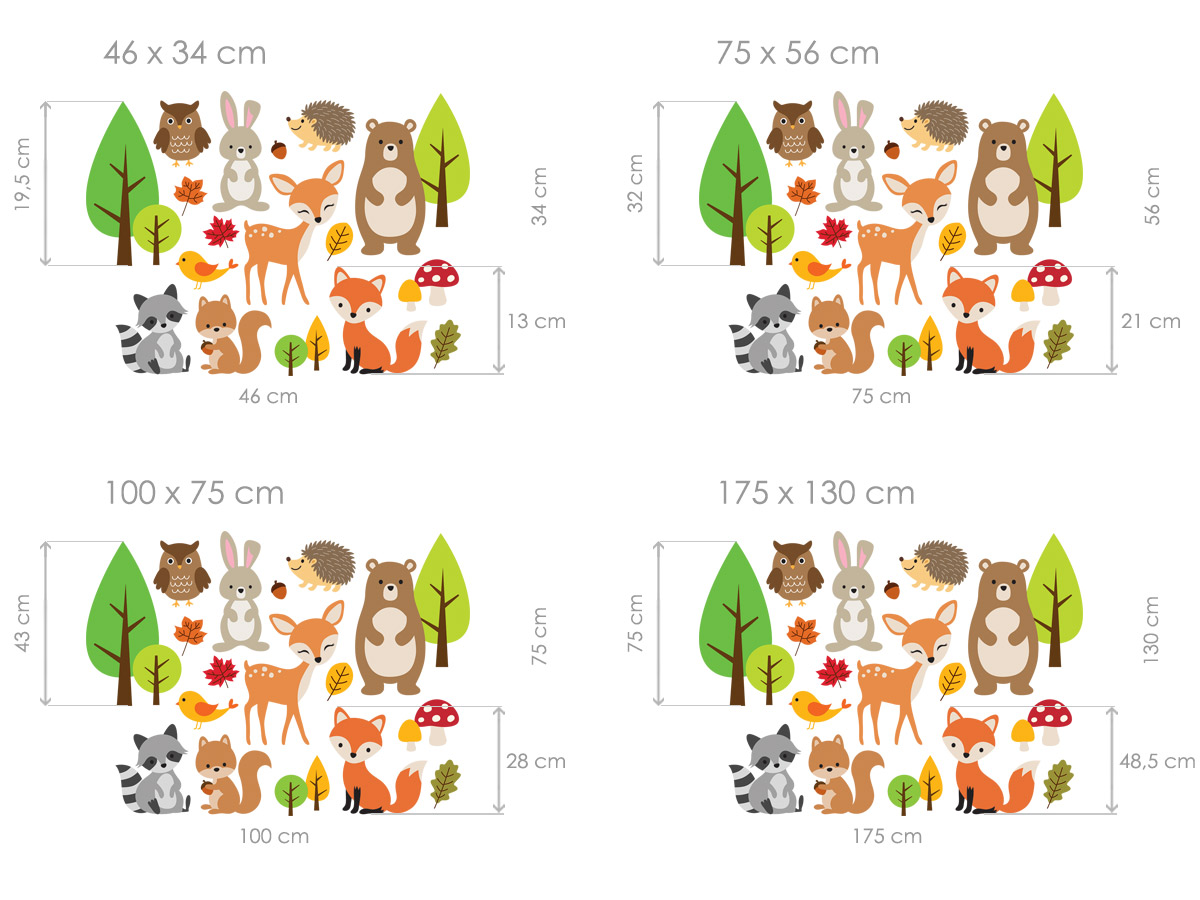 Vytvorte kúzelný lesní svet priímo v detskej izbe s naší sadou „Zvíria z lesa“. Táto hravá kolekcia samolepiek na stenu prináší rozkošná zvírátka – lišku, jalínka, medvedíka, zajaíčka, sovičku, ježka, veveričku, mívala aj vtácka, doplnenýá o farebné stromy, huby a listy. Samolepky sú navrhnuté v jemných, prírodních farbách, ktoré sa skvele hodí do interiéru detskej izby. Vytvorírejí príjemnú a pokojnú atmosféru, v ktoré sa deti budú cítiť šťastne a bezpečne.